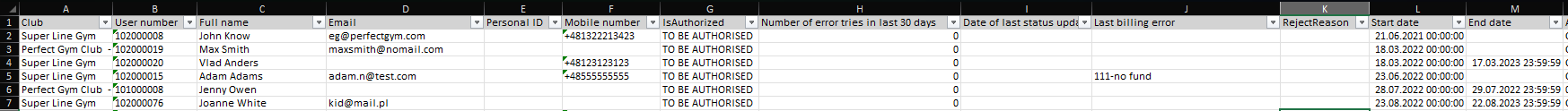 This article is about to give more profound understanding of the Direct Debit Authorization report. The report generates information about the users who chose automatic method of payment in the form of direct debits. It contains basic data of club member, information on users payment history as well as the number of failed payment attempts (also called duplicates).