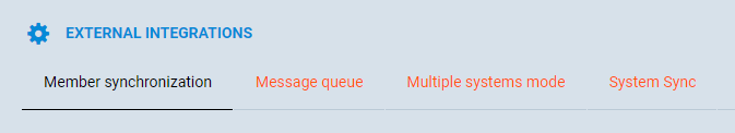 In the External Integration setting, there are multiple tabs present. A member synchronization tab that lists all users that will appear in the external program, Message queue that lists all users in the queue to be synced to the external program, and System sync which shows the filters that can be chosen on what users to send to the external program.