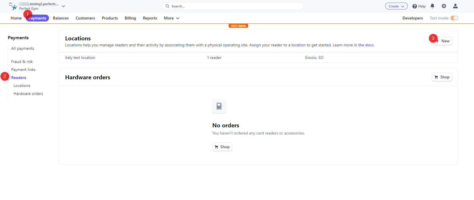 3. Add a new location for the terminal. Go to the Payments tab → Readers on the left side of the screen.