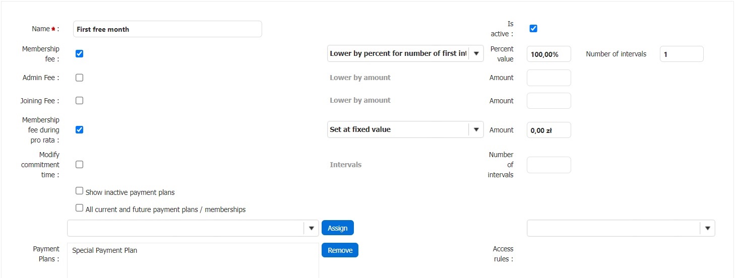 In this article, you will find information on how to set up Contract Discount on a payment plan with the first free interval. You will find here the description of the most important options and fields that are available to be selected during configuration.