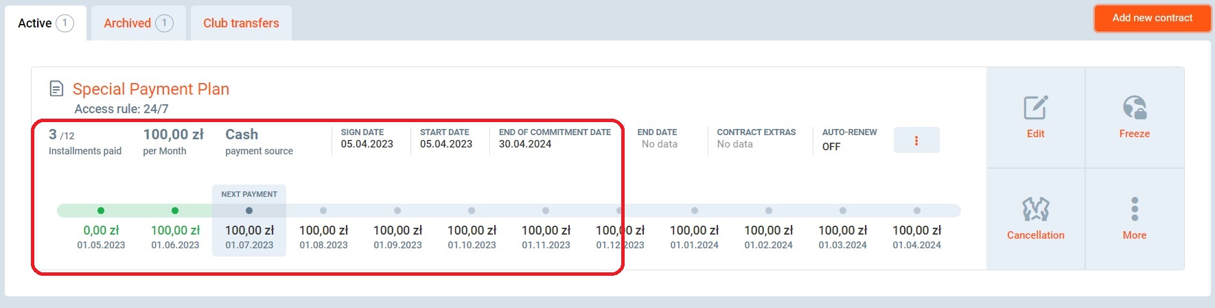 6. After adding the payment plan to a member you will see that on profile that there will be no pro rate and first payment as on the screen below: