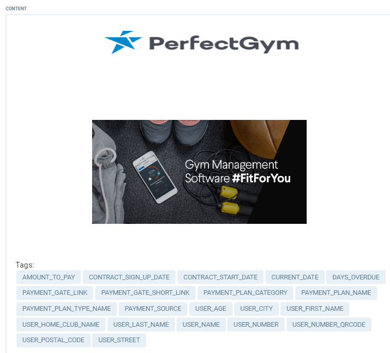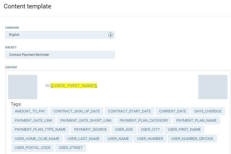 Content - Allows you to create the template content for your notification. If you want to grab information from the system to make it more personalised (like club member name) use the tags below the footer.
