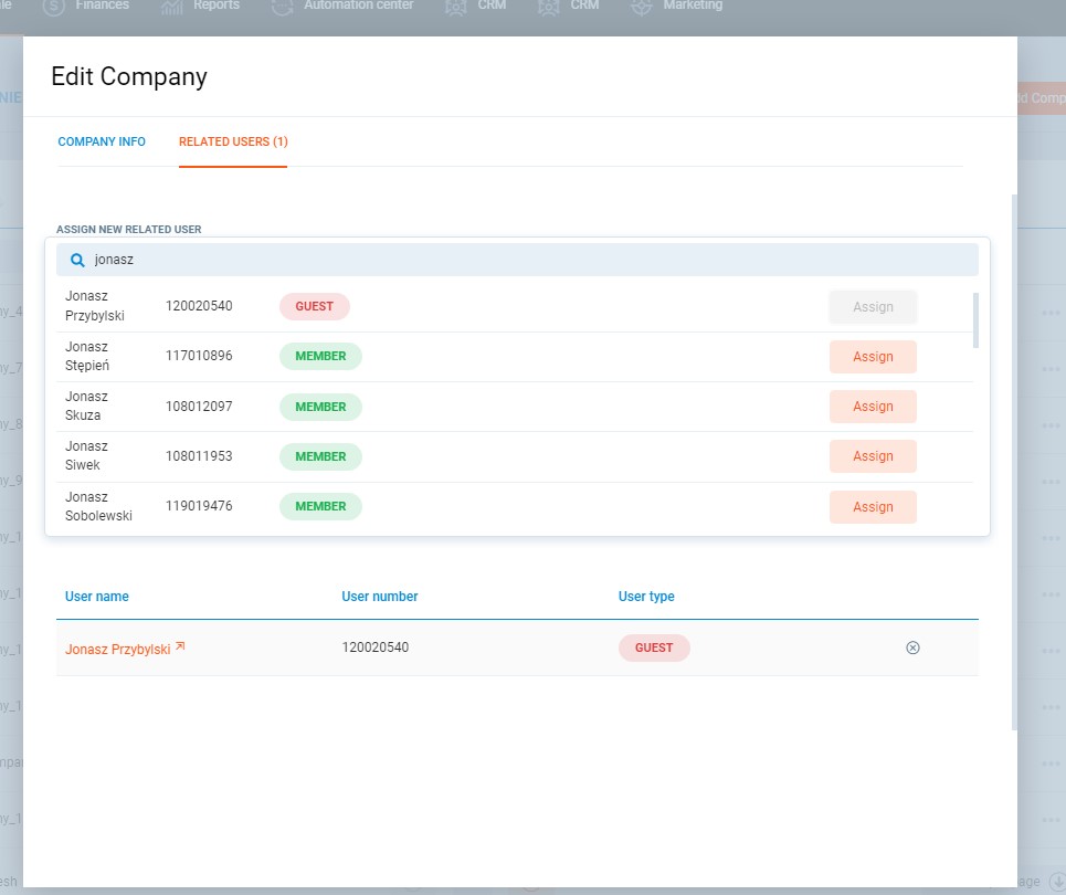 6. In the search box under Assign new related user, enter the name of the User you want to assign to a given Company.