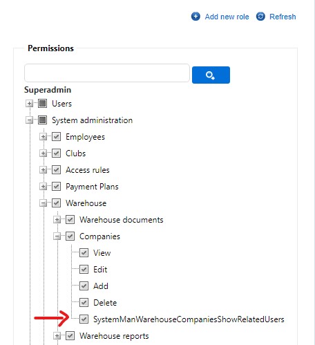 Make sure you have SystemManCompanyWarehouseShowRelatedUser permission selected for your role.