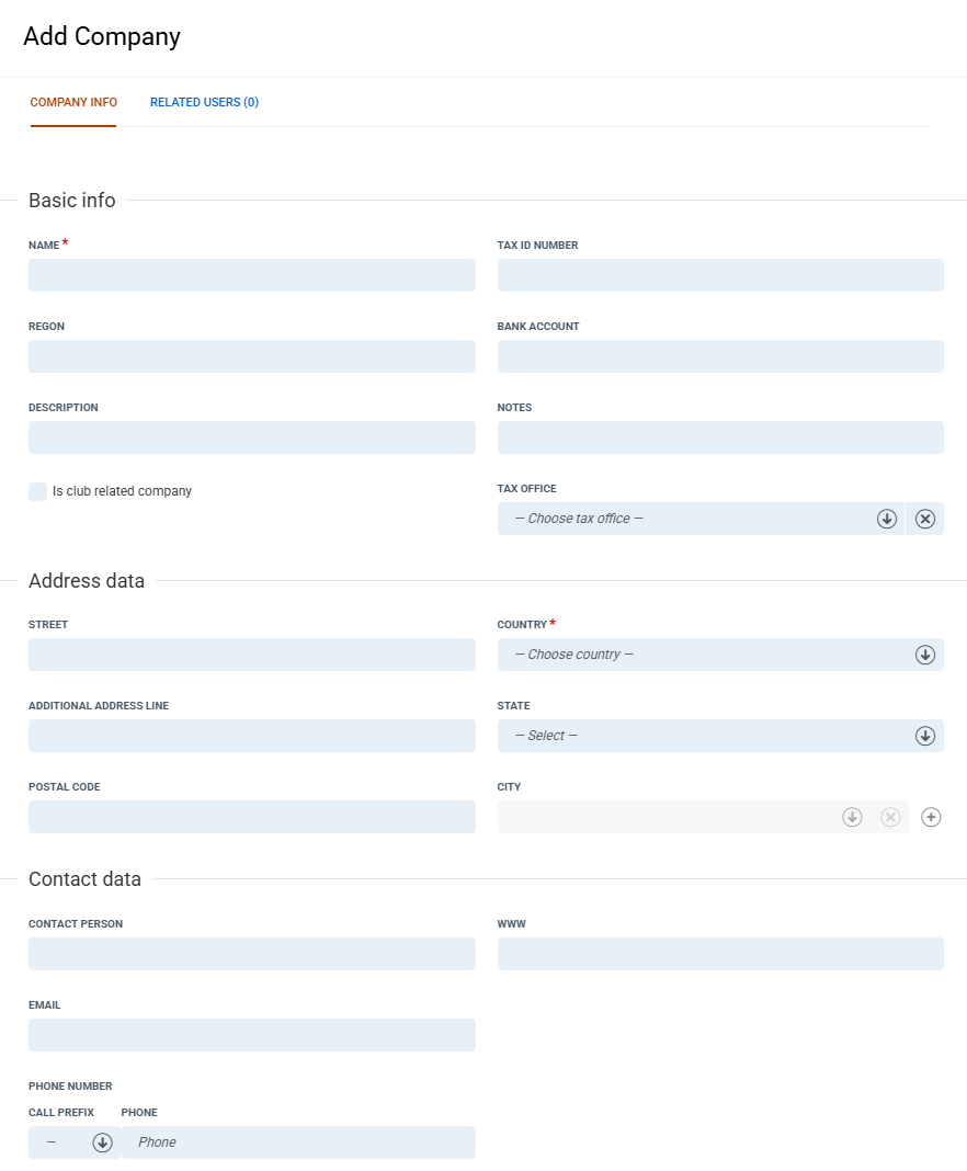 Required Fields: You cannot save a company without providing a Name , Country , and City.