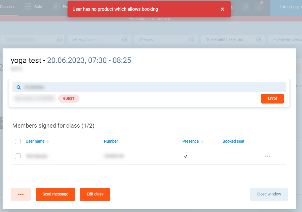I'm unable to enrol user 10100001 in PGM to a group class "Yoga" in time table which is taking place on the 20th of June, I can see the problem is with enrolling this user to this class also on any other days. I get a notification that user has no product which allows booking, however I assigned such product to this user. This notification displays after clicking "Enrol" button visible in the attached screenshot.