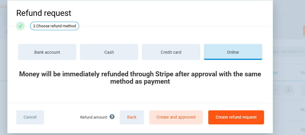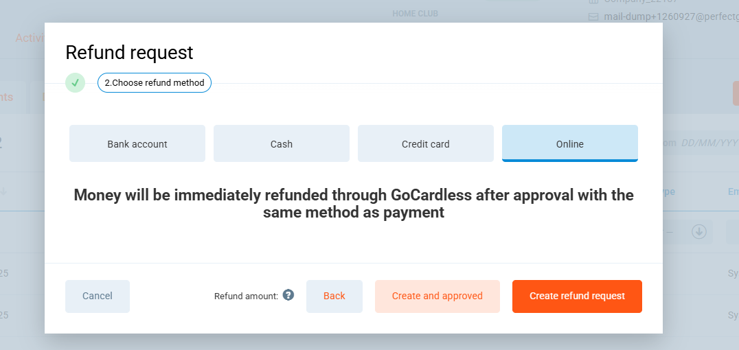 This article shows how to create and process an Online Refund Request in the PGM. Online refund stands for returning money via the payment provider, currently supported in Perfect Gym by Stripe, Cloud Payments, Monneris and GoCardless.