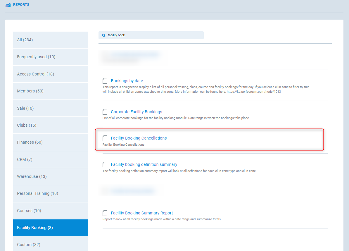 Either using the search filter, find Facility booking cancellations report or select Facility booking tab and find the report.