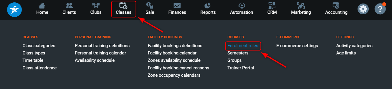 To access Discounts within Enrolment rules, go to PGM->Classes->Enrolment Rules.