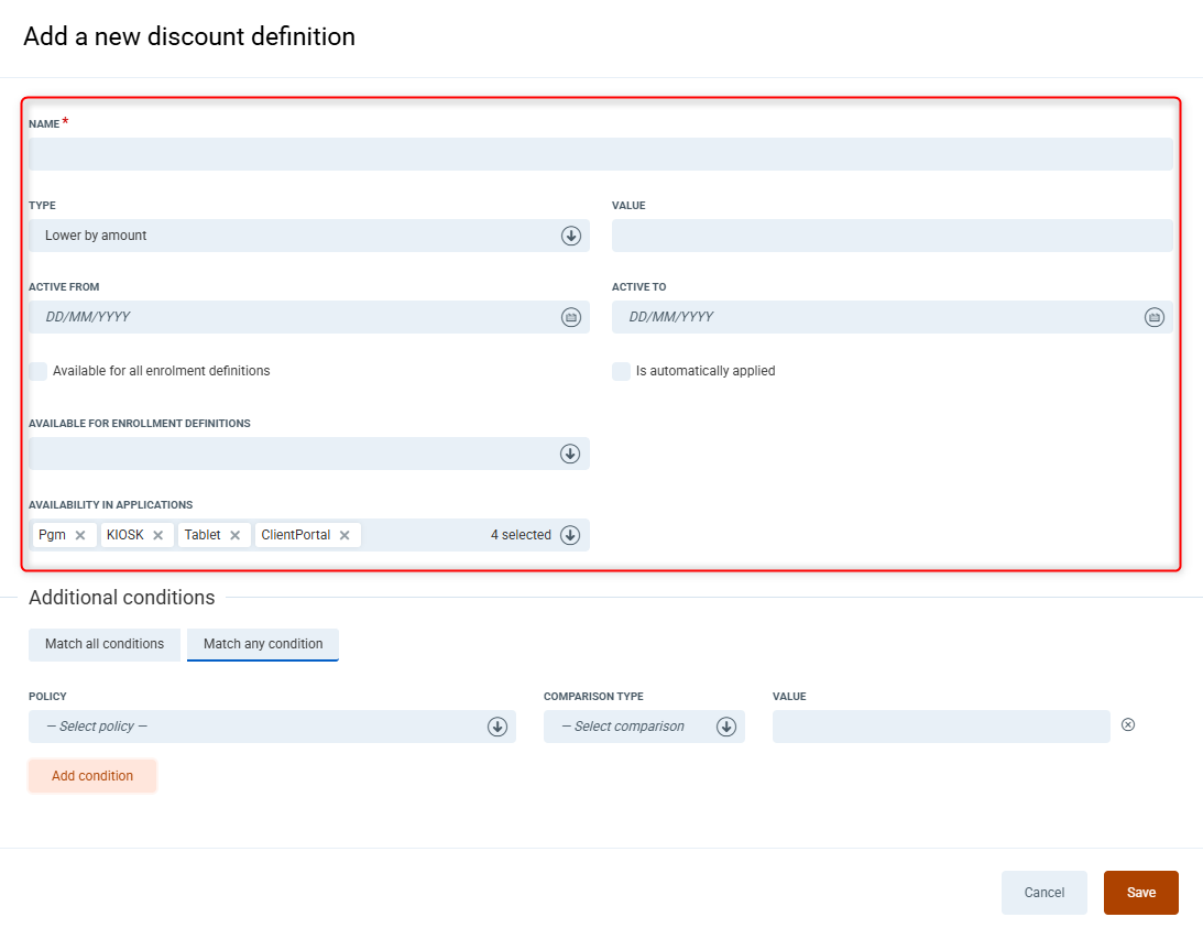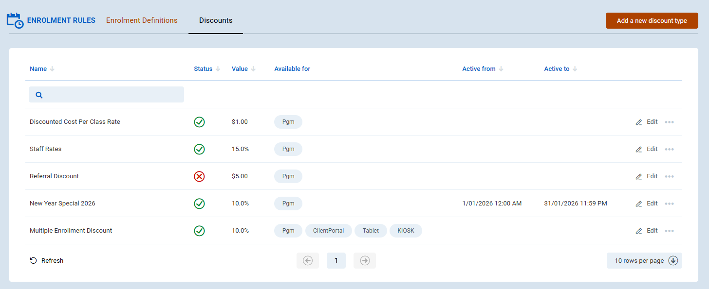 Available for enrolment definitions: If Check box of 'Available for all enrolment definitions' is unticked, select the enrolment definitions that can use this discount.