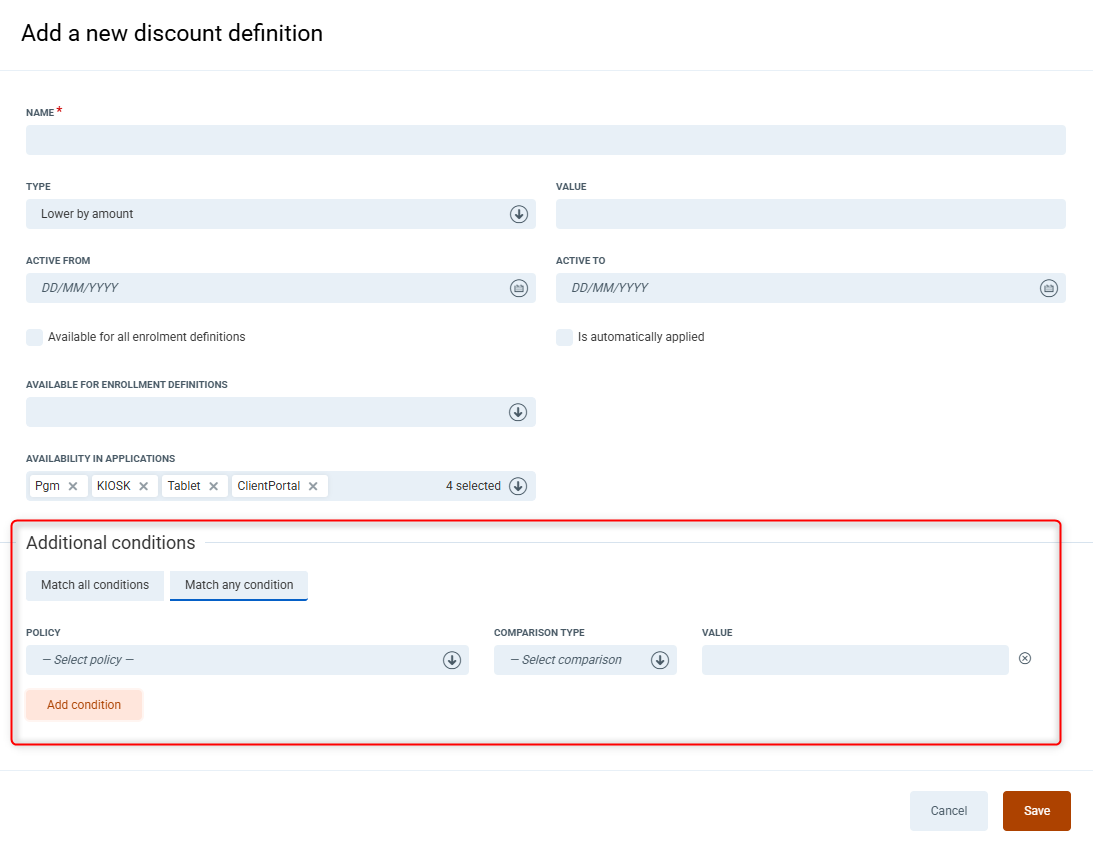 Availability in applications: A multi-select dropdown to control which applications (e.g., PGM, Client Portal, KIOSK, Tablet) this discount is available in.