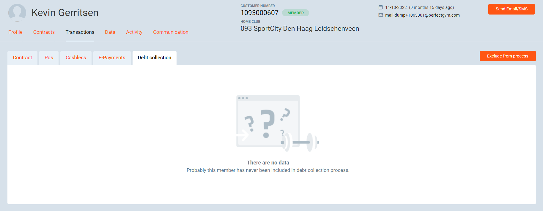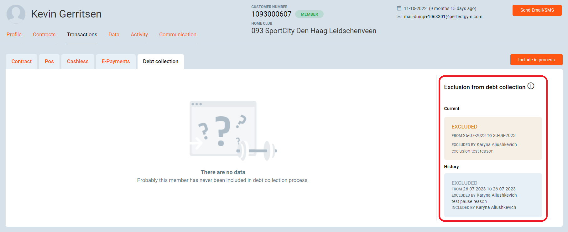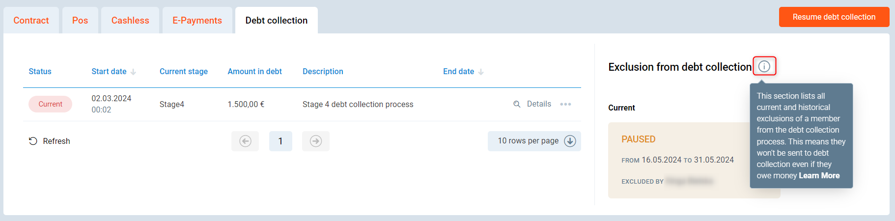 If there is a need to resume debt collection process for a specific member, simply navigate to the Member profile -> Transactions -> Debt collection and select the Resume debt collection button; to include member to debt collection process click on the Include in process button.
