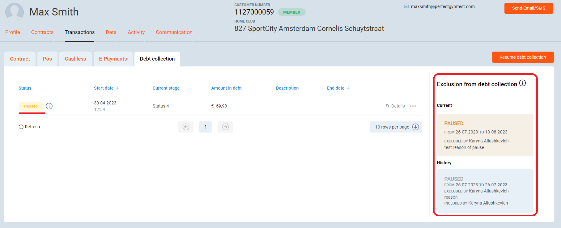 6. After the specific member is paused, the status of the debt collection process will be changed from the "Current" to "Paused". Besides that on the right side of the Debt Collection tab Current and History communications will be displayed. Each of them contains: