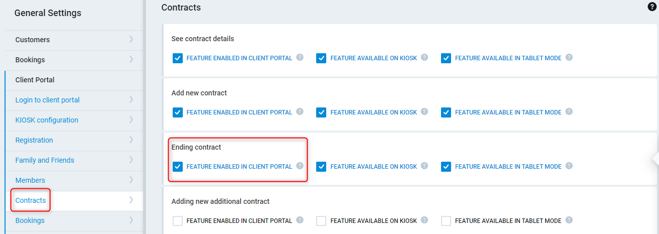 3. Search for Ending contract and tick Feature enabled in Client Portal.