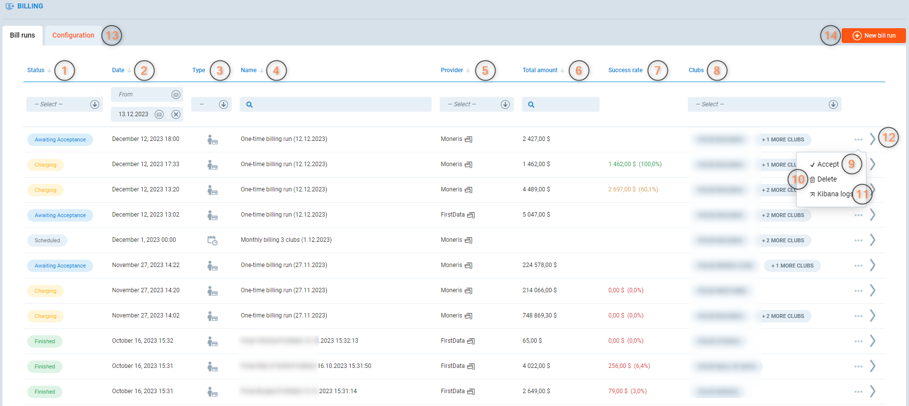 NOTE: statuses in individual clubs as displayed in bill run clubs view (12) may differ, as bill run is processed in each club separately.