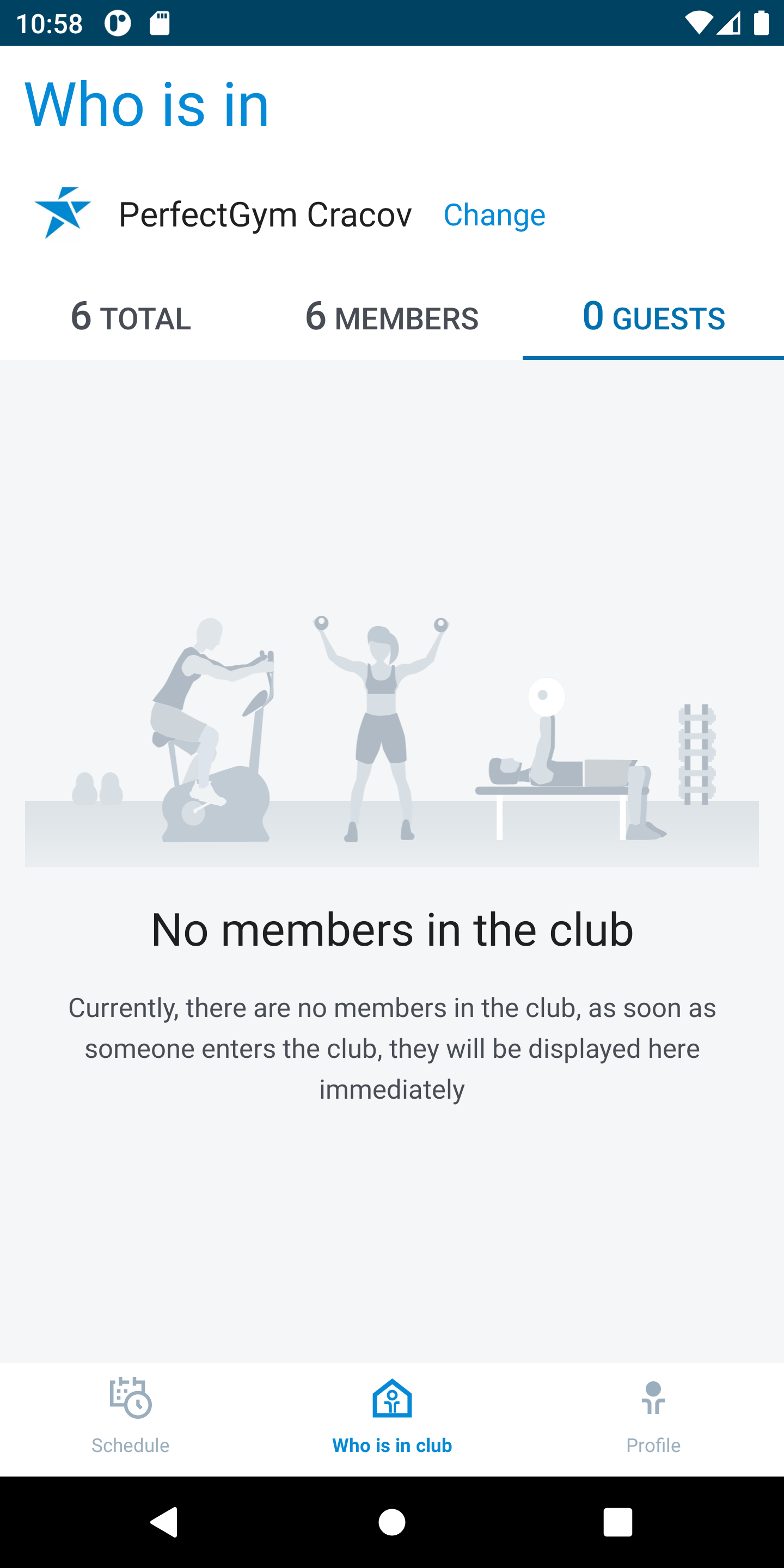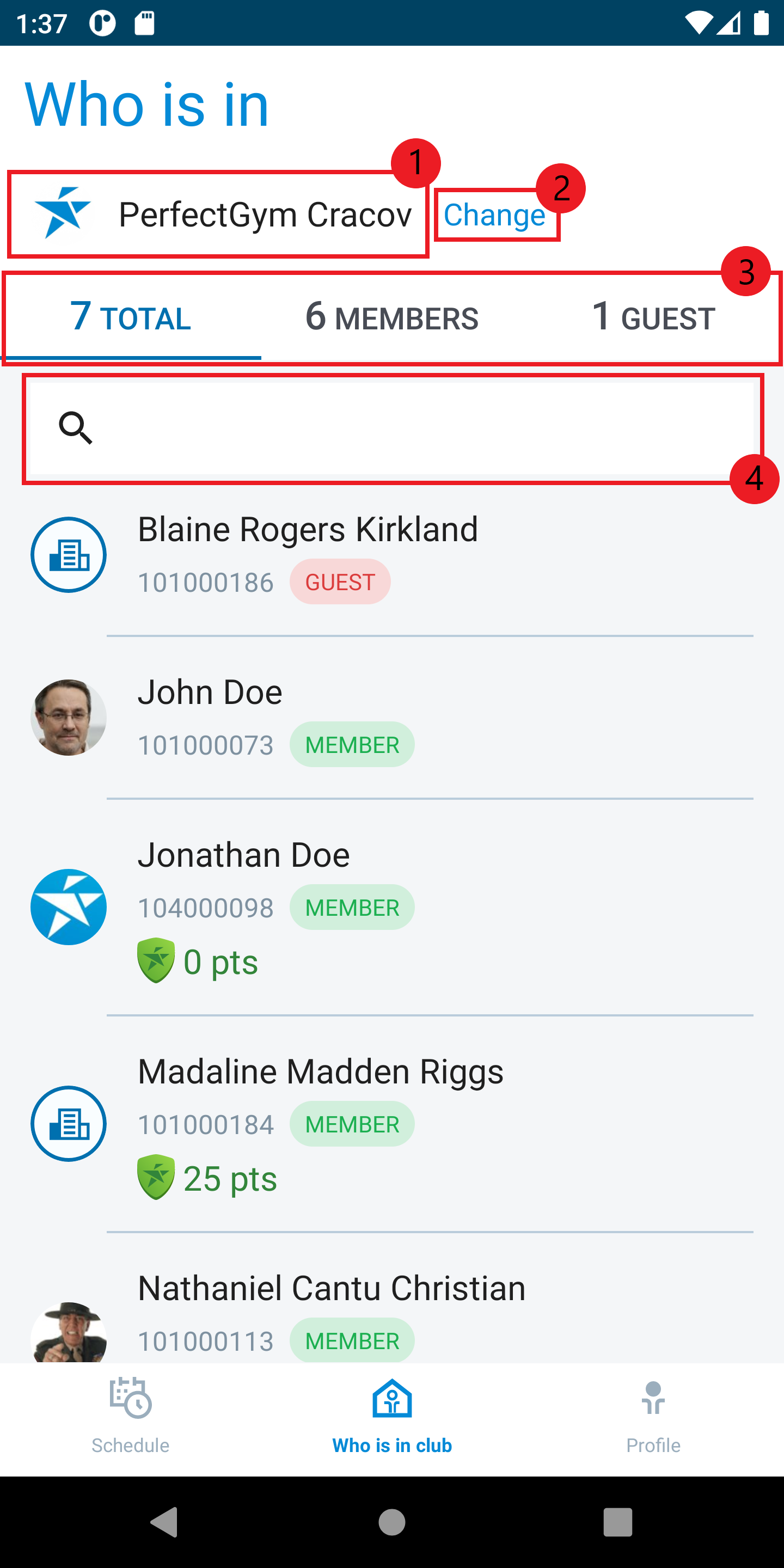 - After choosing a club you will see who is in screen with list of members and guests present at the club.