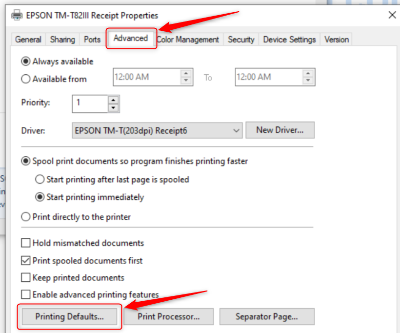 6. Click on Printing Defaults