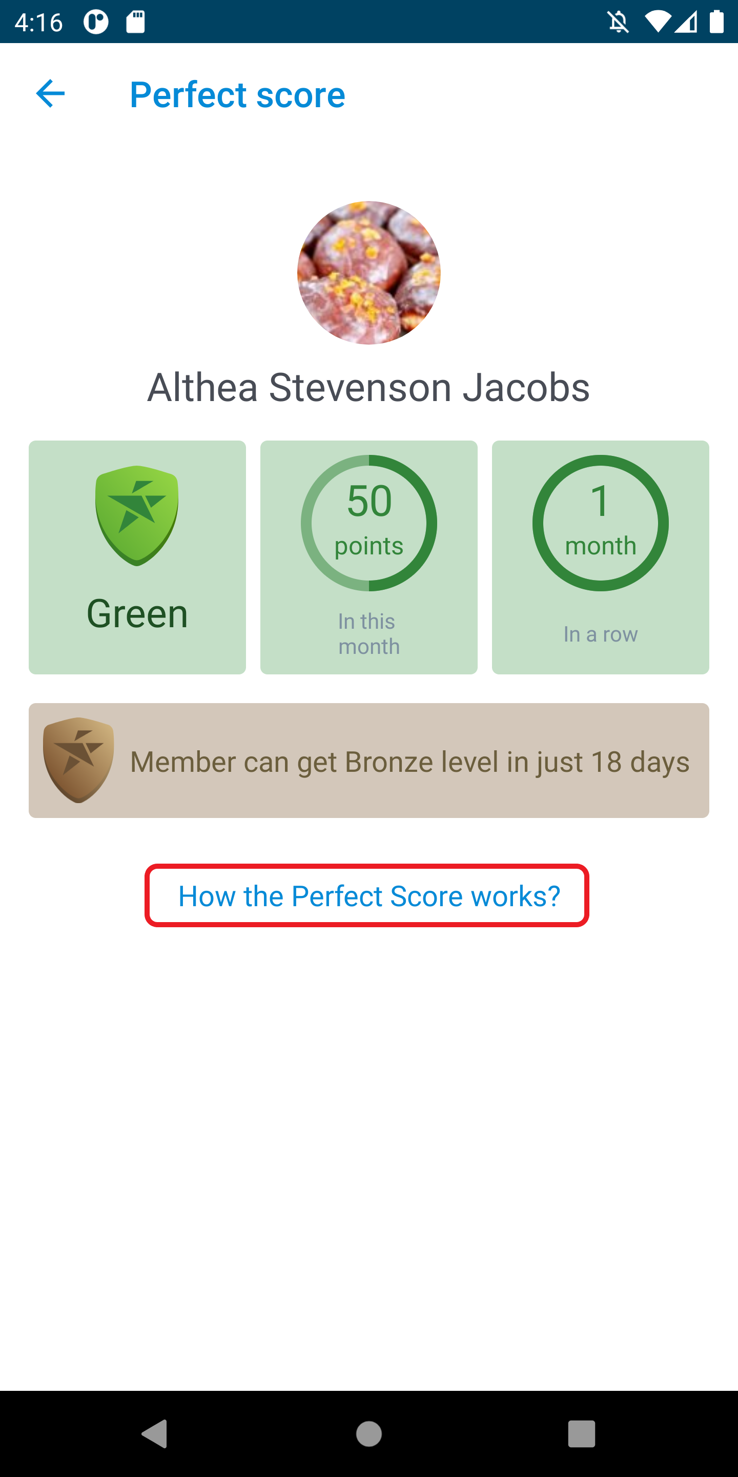 To find out more details about Perfect Score, click on the perfect score widget on the member profile screen to be taken to a new screen.