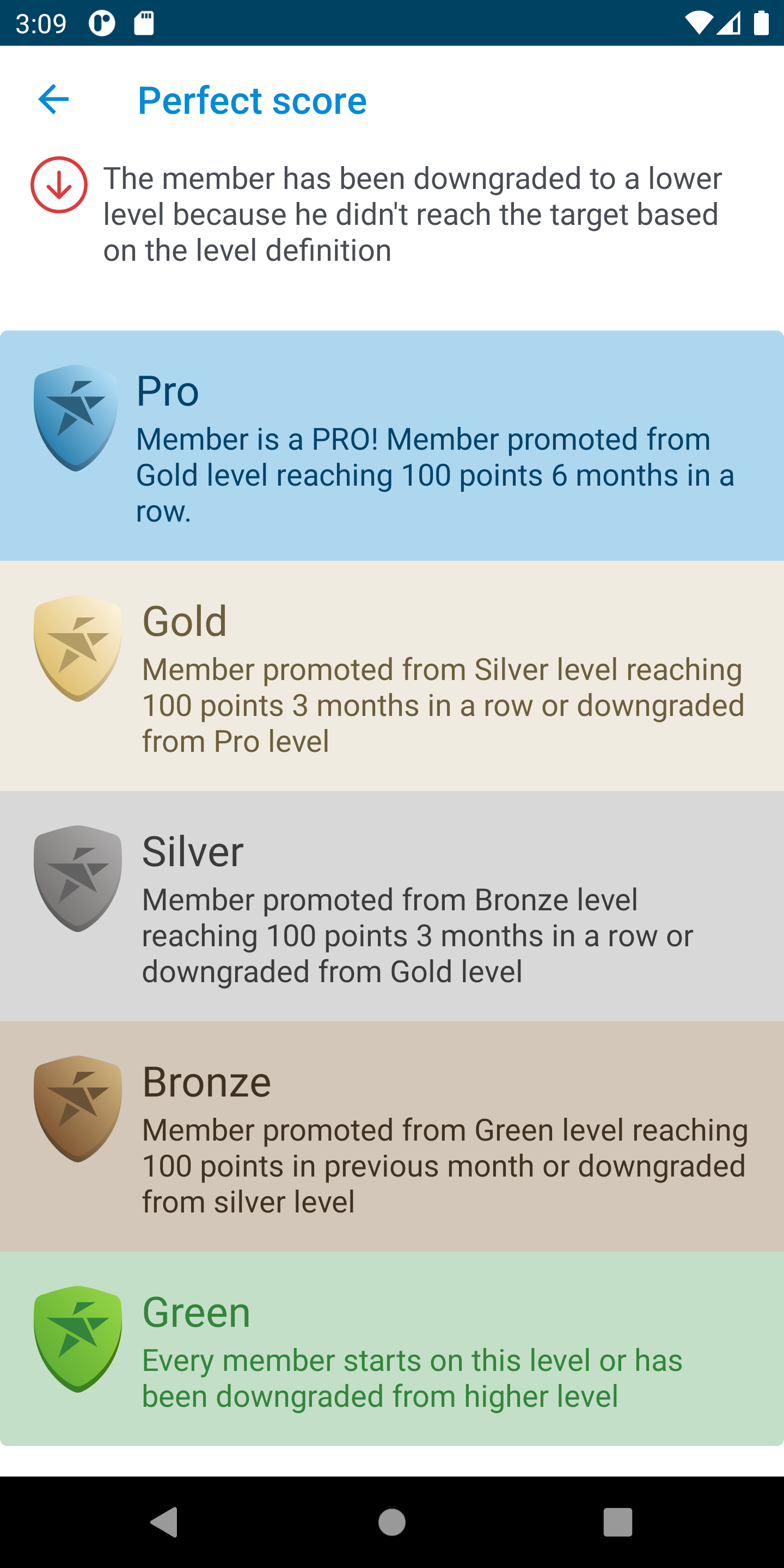 A user starts at the lowest level, which is Green, so a user cannot be demoted from this level. The Pro level is the highest level, so the user cannot advance from it.