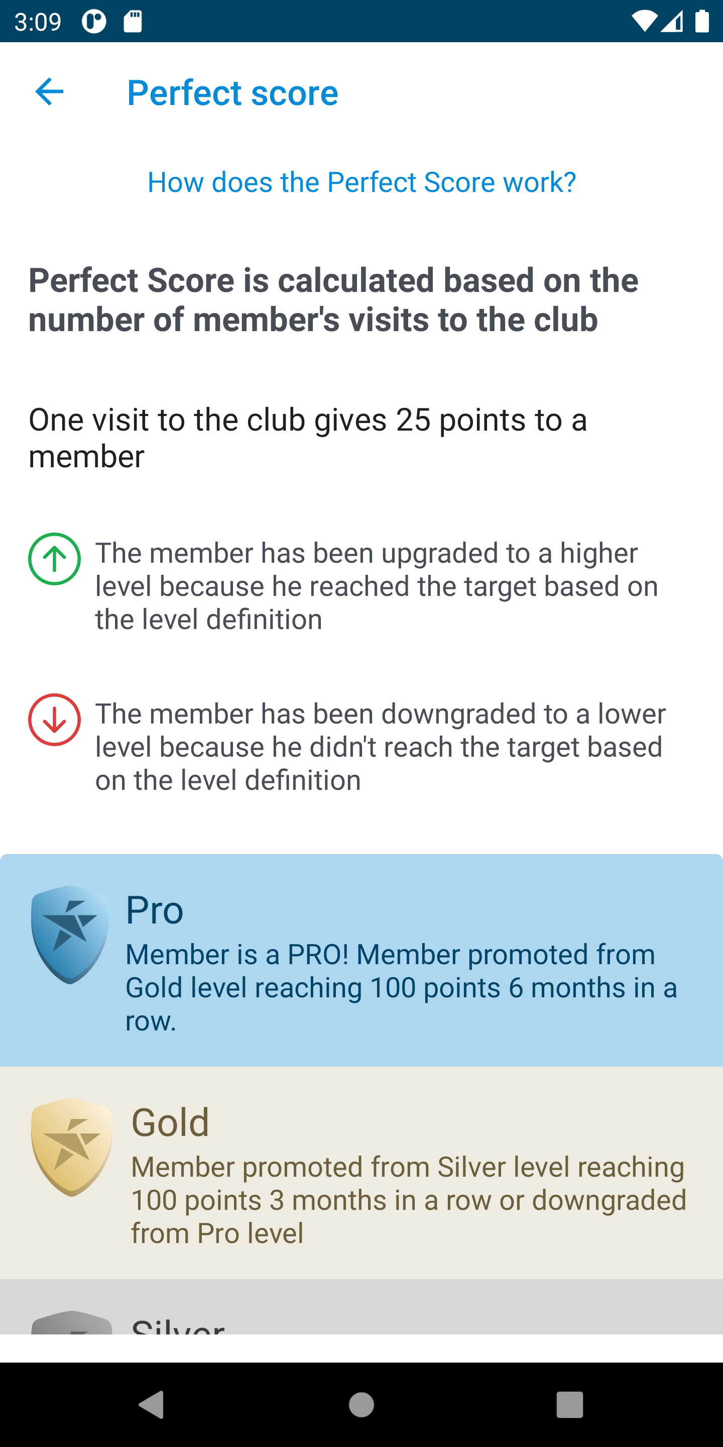 After clicking the How the Perfect Score works? text the screen content will change and a description of the Perfect Score levels, information how points are calculated and a legend will appear on the screen.