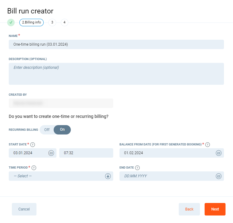 Recurring billing - select one-time or recurring bill run. Recurring bill runs will be generated in the interval selected in Time period field.