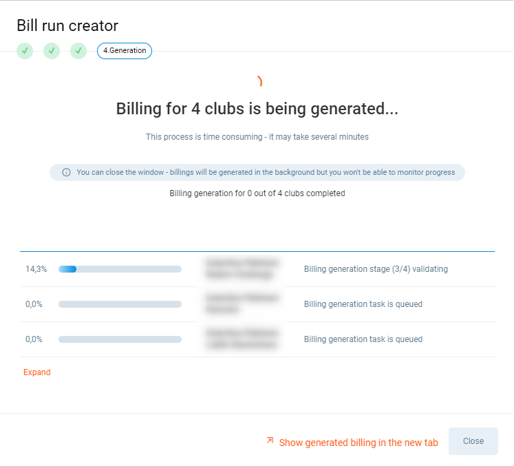 If Execute bill run has been selected in step 1, the bill run is generated in this step. The progress is displayed as shown on the screen above - for each club separately.