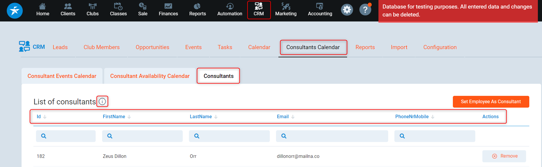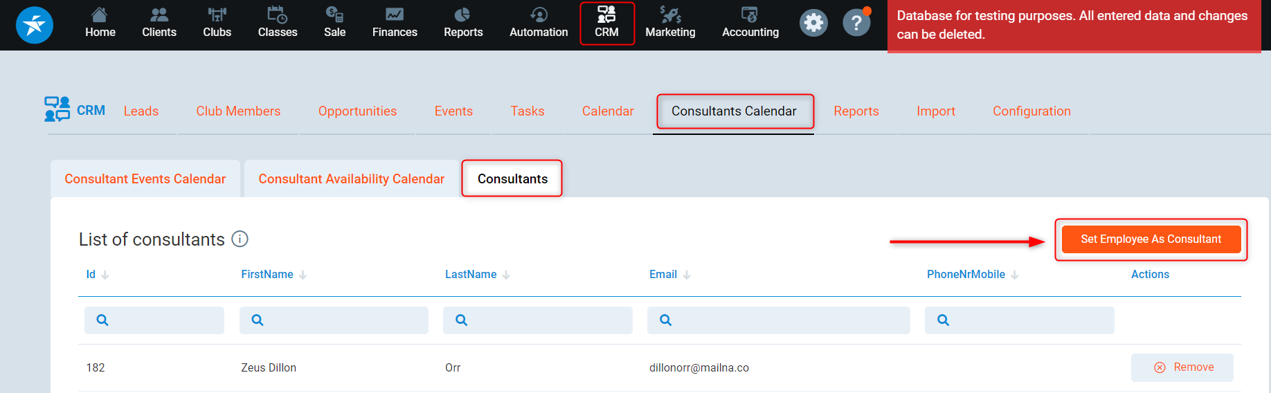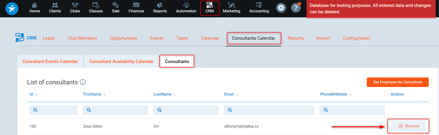 1. Go to CRM -> Consultants Calendar -> Consultants tab and click the Remove button related to the consultant you want to remove.