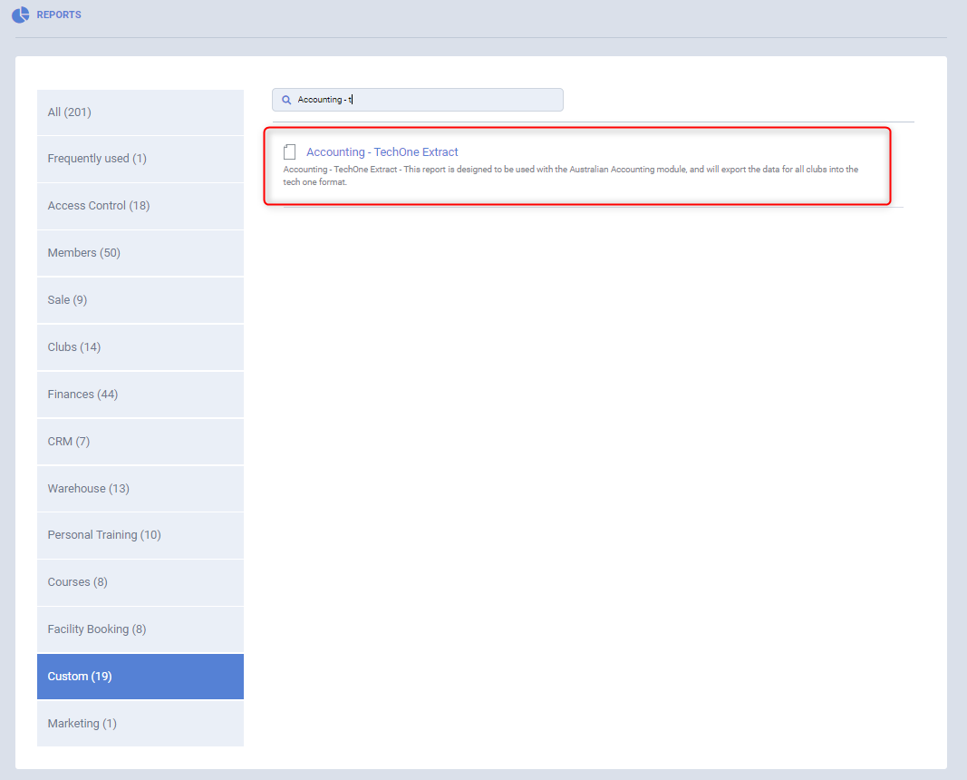 To find the report, go to the Custom Tab and search for the report Accounting - Tech One