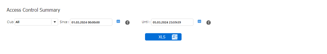 - Access control summary report displays information about the number of entrances to the club divided into: user`s type, purpose of the visit (club member, the meeting), gender and access rule set/tickets with which they entered the club.