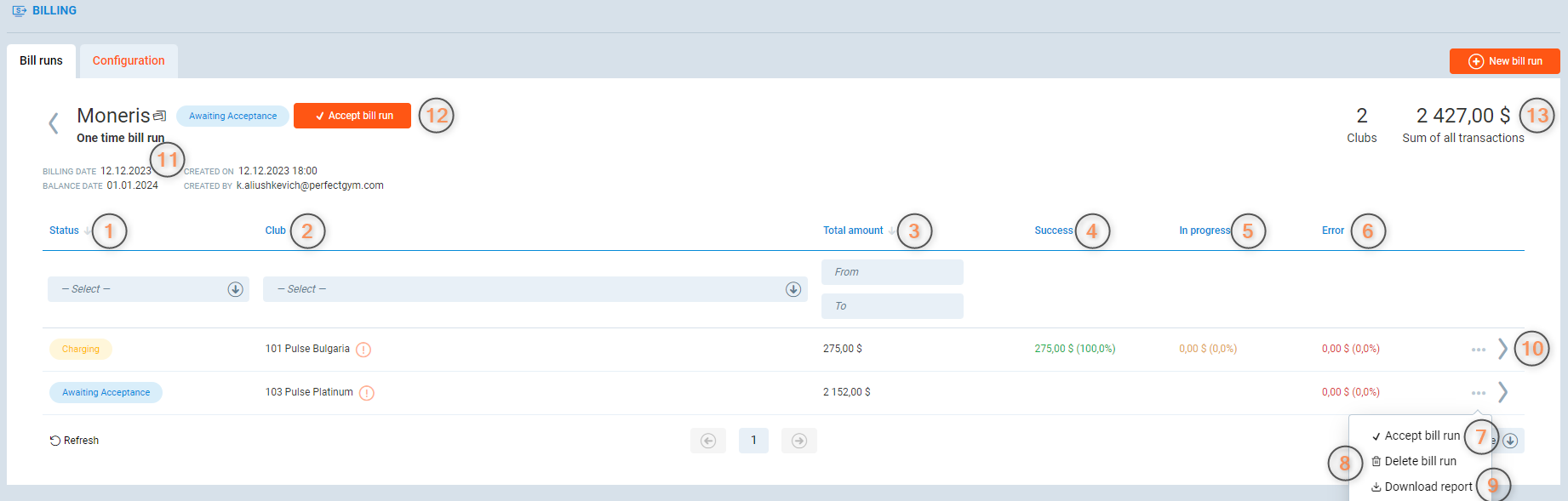- Bill run data split into respective clubs, that the bill run has been generated for is displayed in the bill run clubs view, described in this article