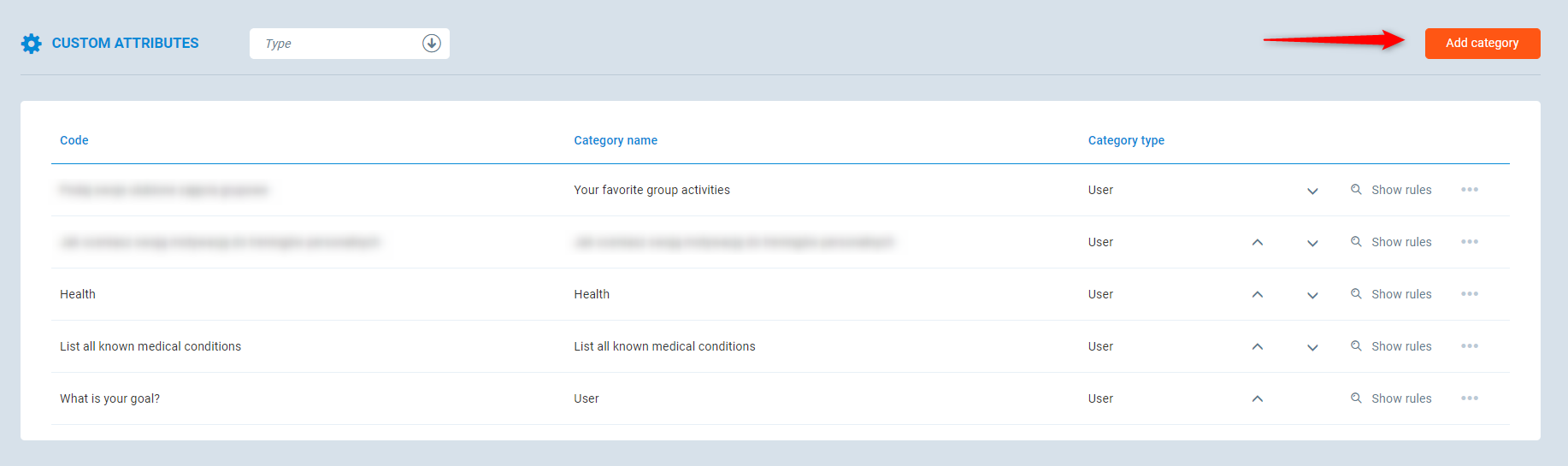 1. To add a new custom attribute in the category, press the ●●● icon next to the category and press Add type.