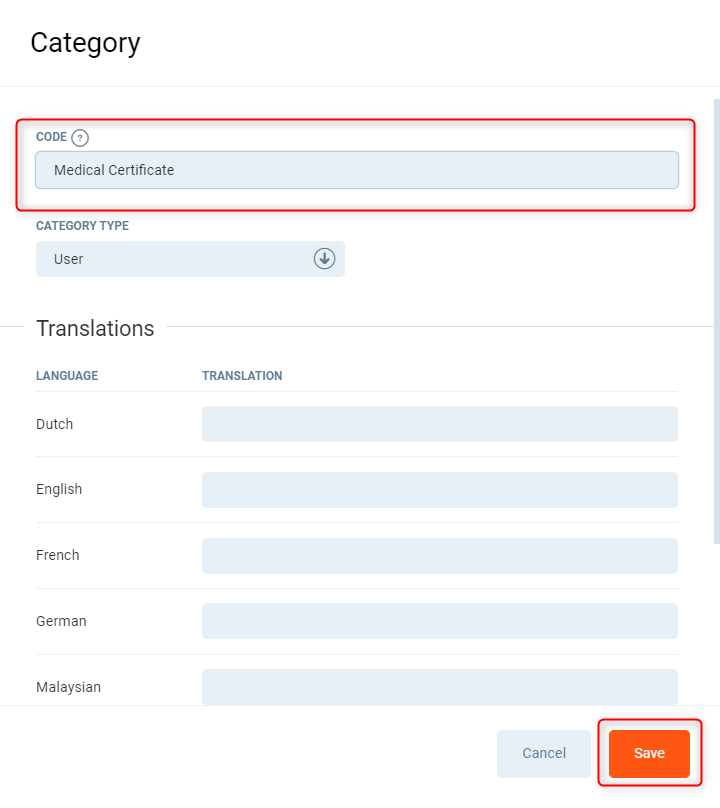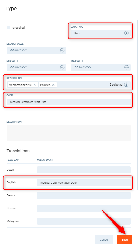 - Translation - in the language you use on your site, enter the type name Medical Certificate Start Date, this will be displayed in PGM and Client Portal.
