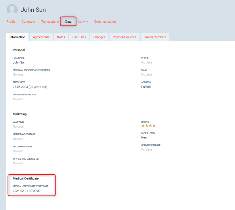 - After adding the document, information about its validity will be visible on the member's profile under Data tab.