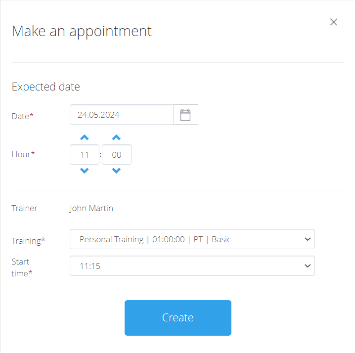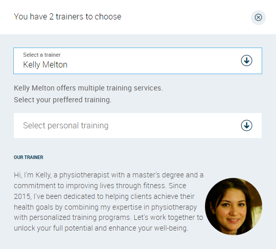 After that, you can see personal trainers' availability during the week. If personal training sessions are booked, it will be reflected by the trainer’s photo being greyed out. To enroll a member for a training choose the trainer and the time at which they want their session to be scheduled. A new pop-up window will be displayed with information about the expected date when the training will take place. Specify the exact personal training definition, as well as precise start time, based on intervals configured earlier.