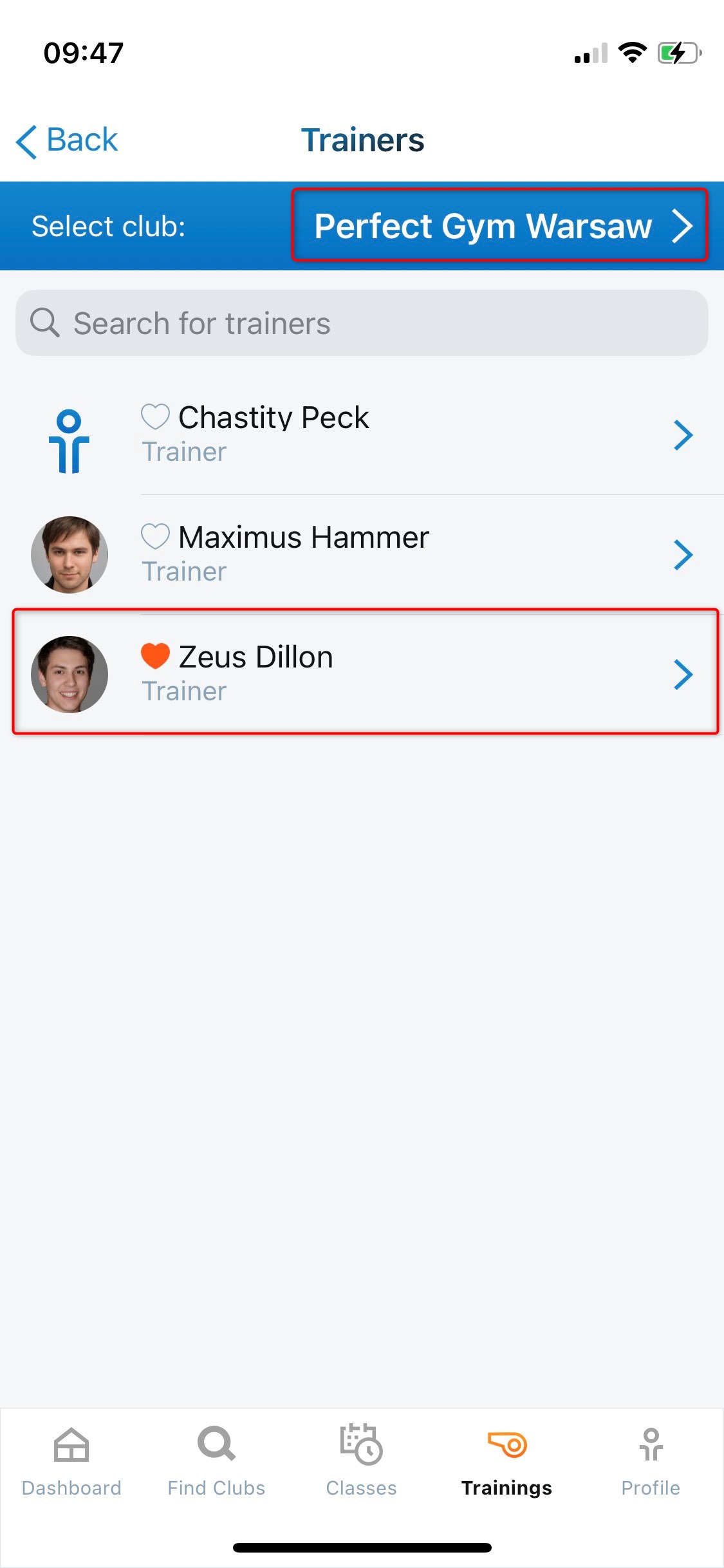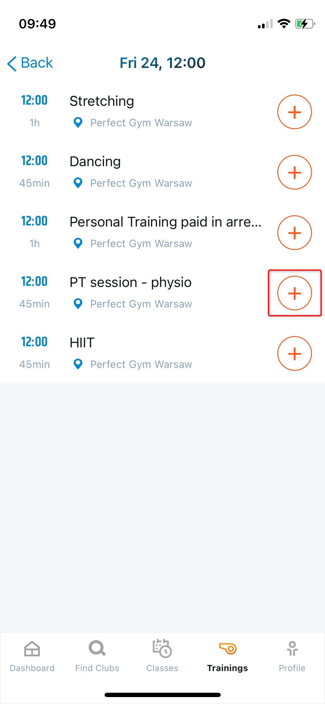 To book Personal Training in the PG GO you need to open the mobile application. The booking process can be done from two places in the app. In both ways, the flow stays the same. In the Trainings tab, you can see the list of upcoming training sessions, as well as schedule new ones. The process starts with selecting the available trainer.