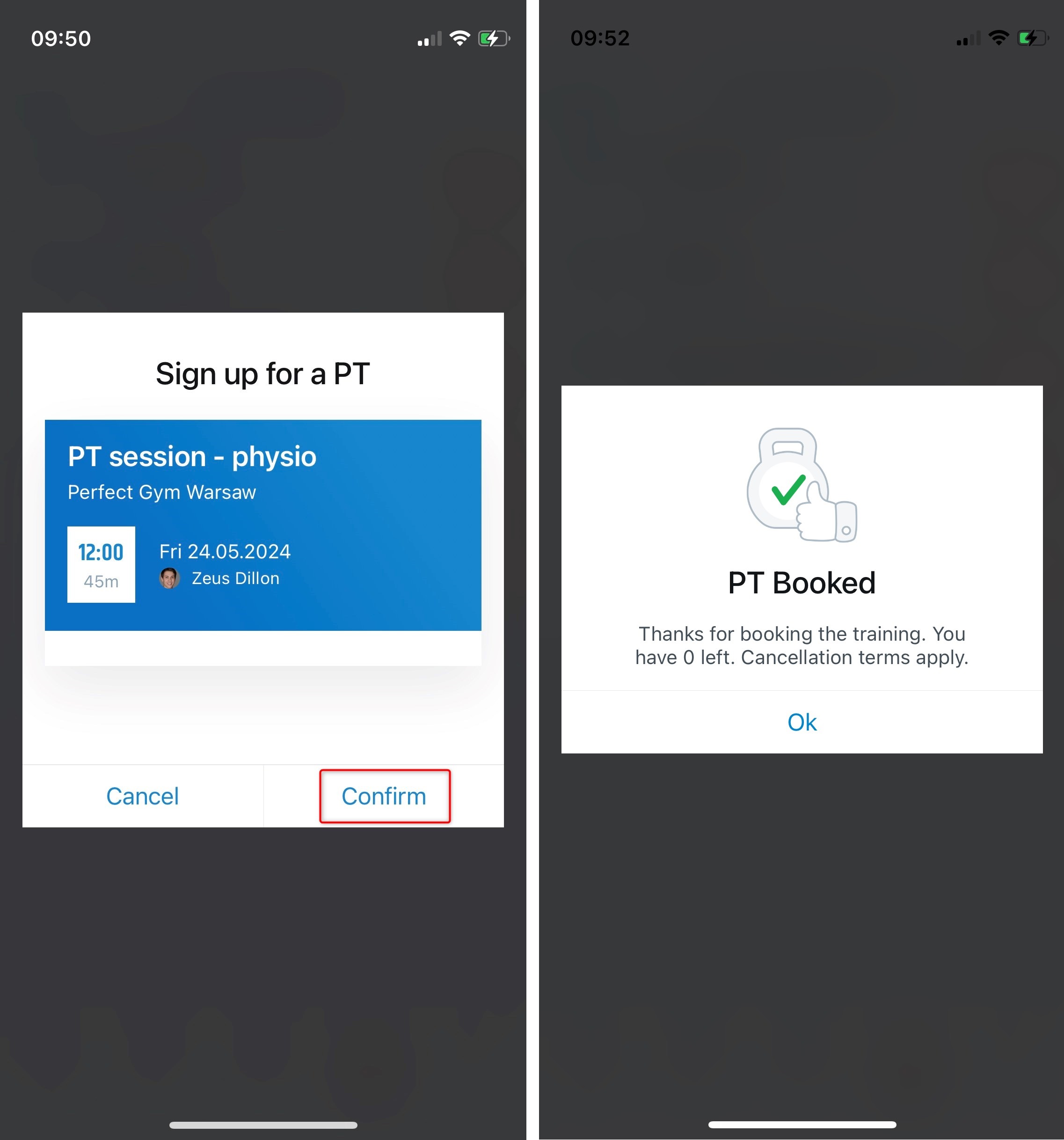 A confirmation screen will pop up with all the booking details. If you have the required product for booking, the session will be scheduled once you press the confirm button.