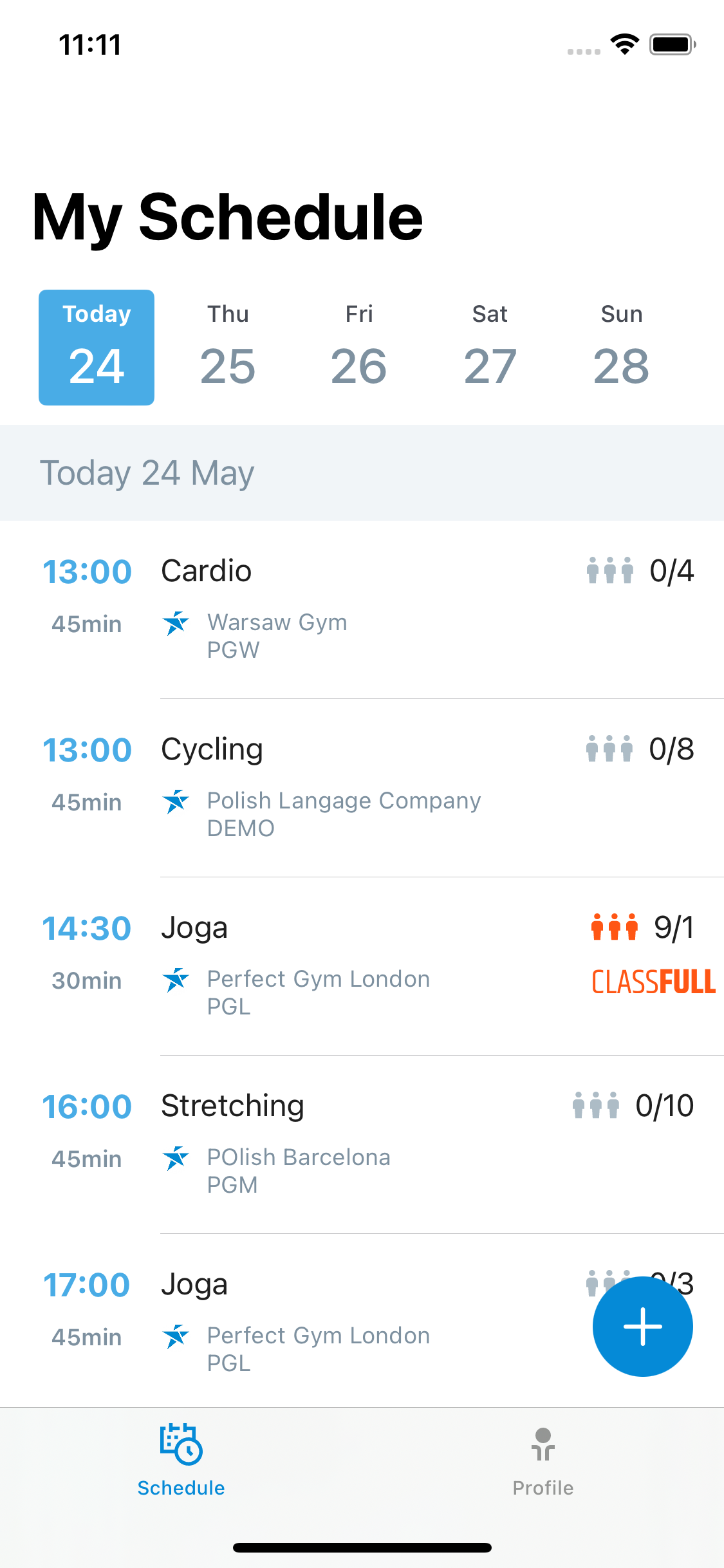 To book Personal Training in the PRO app you need to open the mobile application. You will be met by my schedule screen, where you can find all PT sessions as well as scheduled classes you perform. Click on the + icon to add a new booking.