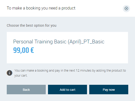 If you don't have the product necessary for booking, the system will suggest products that can be purchased in order to book this training and then guide you through the sales process.