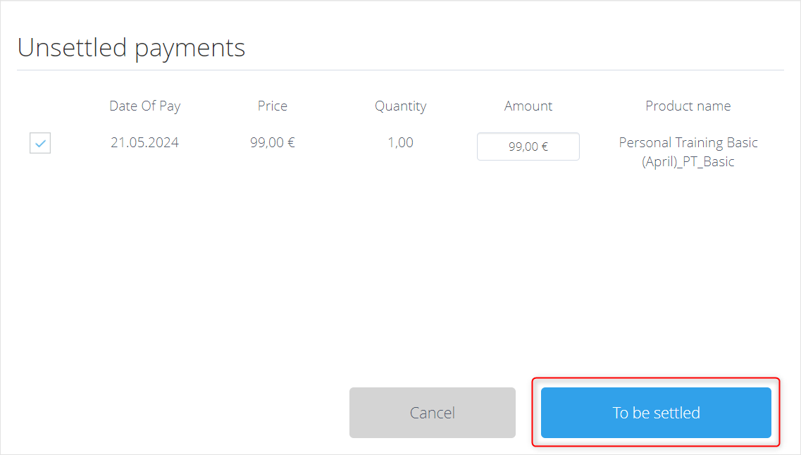 Press Settle and you will see all unsettled payments of this member, with information about the date of payment, price, product quantity, the total amount to pay as well as the product name. Press to be settled, choose the payment method and finish the sales process.