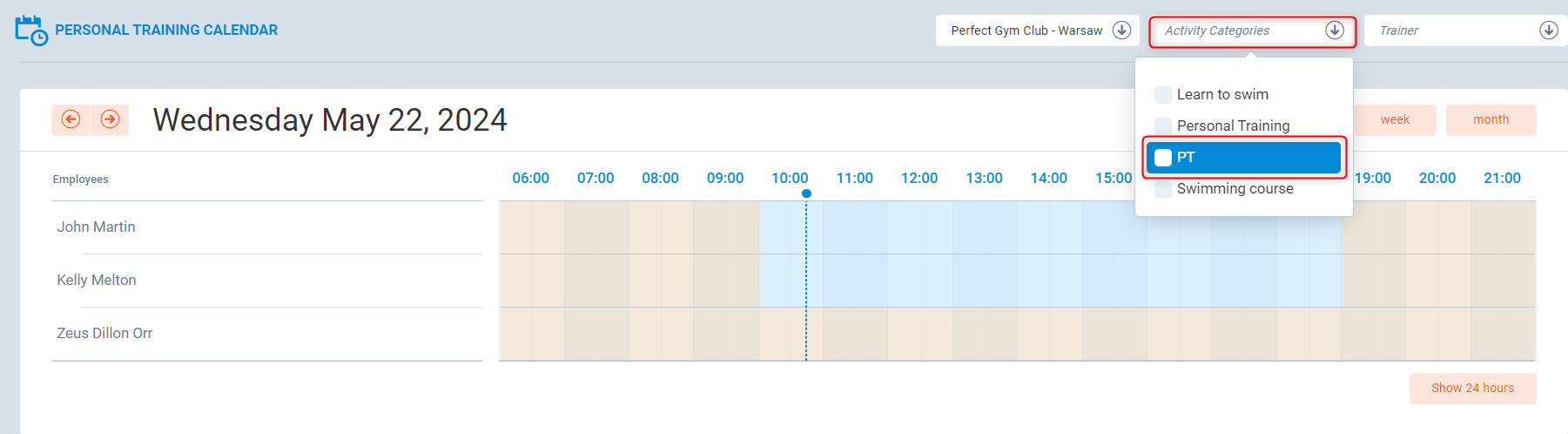 This will display the calendar view with all activities scheduled in the club, assigned to specific trainers. To see the personal training schedule exclusively, use the Activity Categories filter and select PT.