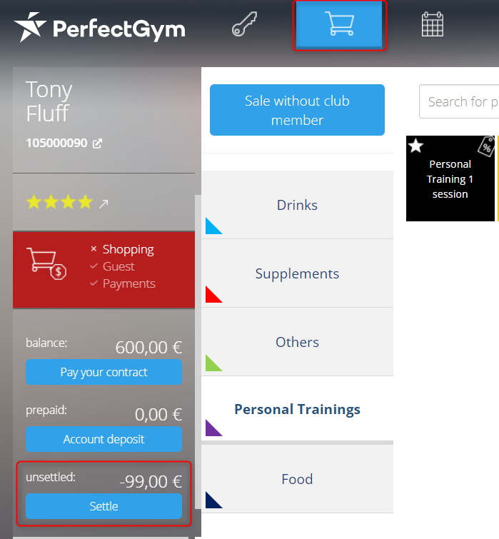 After choosing the product to be used for booking and pressing Create the system will verify if the member has the product required for booking. If they don't go to the POS tab and on the bottom of the left side of the screen you can see member’s unsettled transactions.