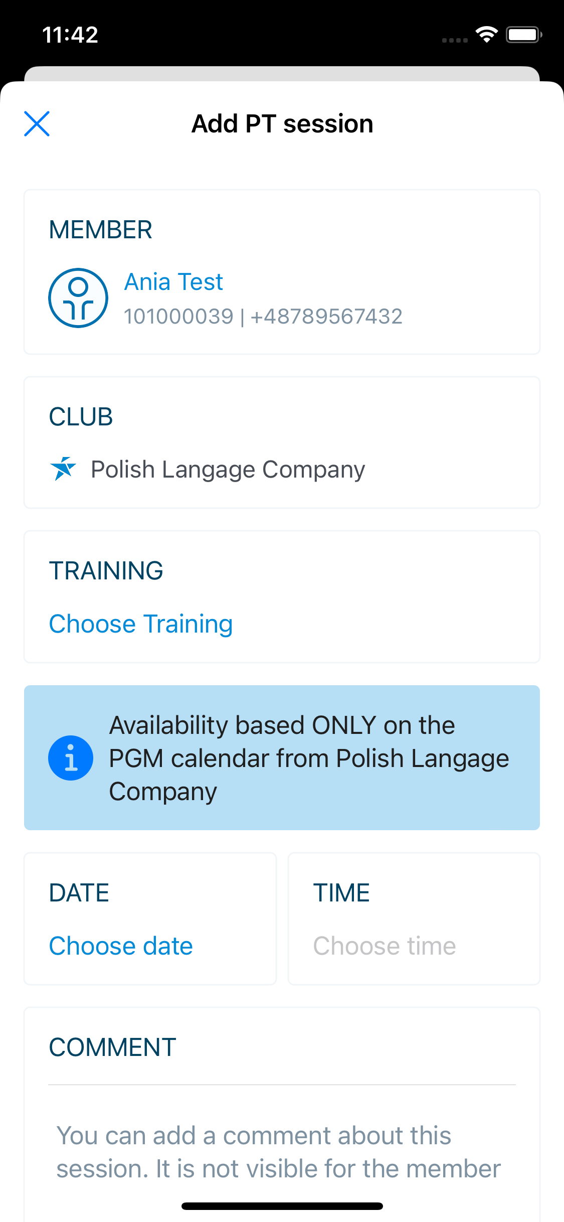 - Member - search for a particular member, a few members will always be suggested while creating PTs.