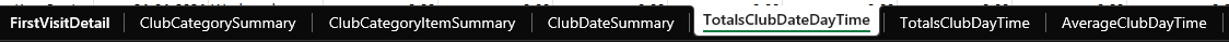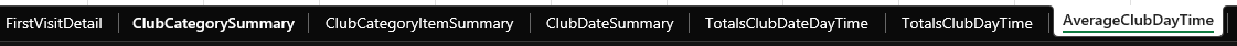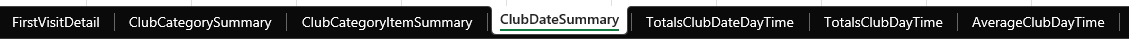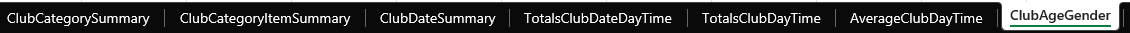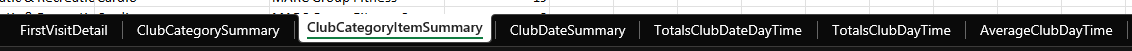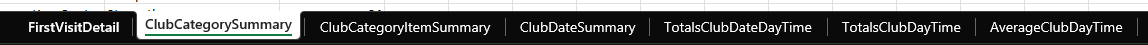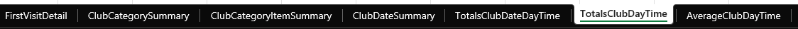 This report will summarize data for a specific club, utilizing the information generated in the following tabs: ClubDateSummary, TotalsClubDayTime, AverageClubDayTime, TotalsClubDateDayTime, ClubCategorySummary, ClubCategoryItemSummary, and ClubAgeGender. By filtering the data to focus solely on that club, it becomes more straightforward to create tailored reports for various clubs.