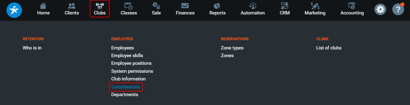 1. To access the report, go to PGM -> Clubs -> Employees -> Commissions.