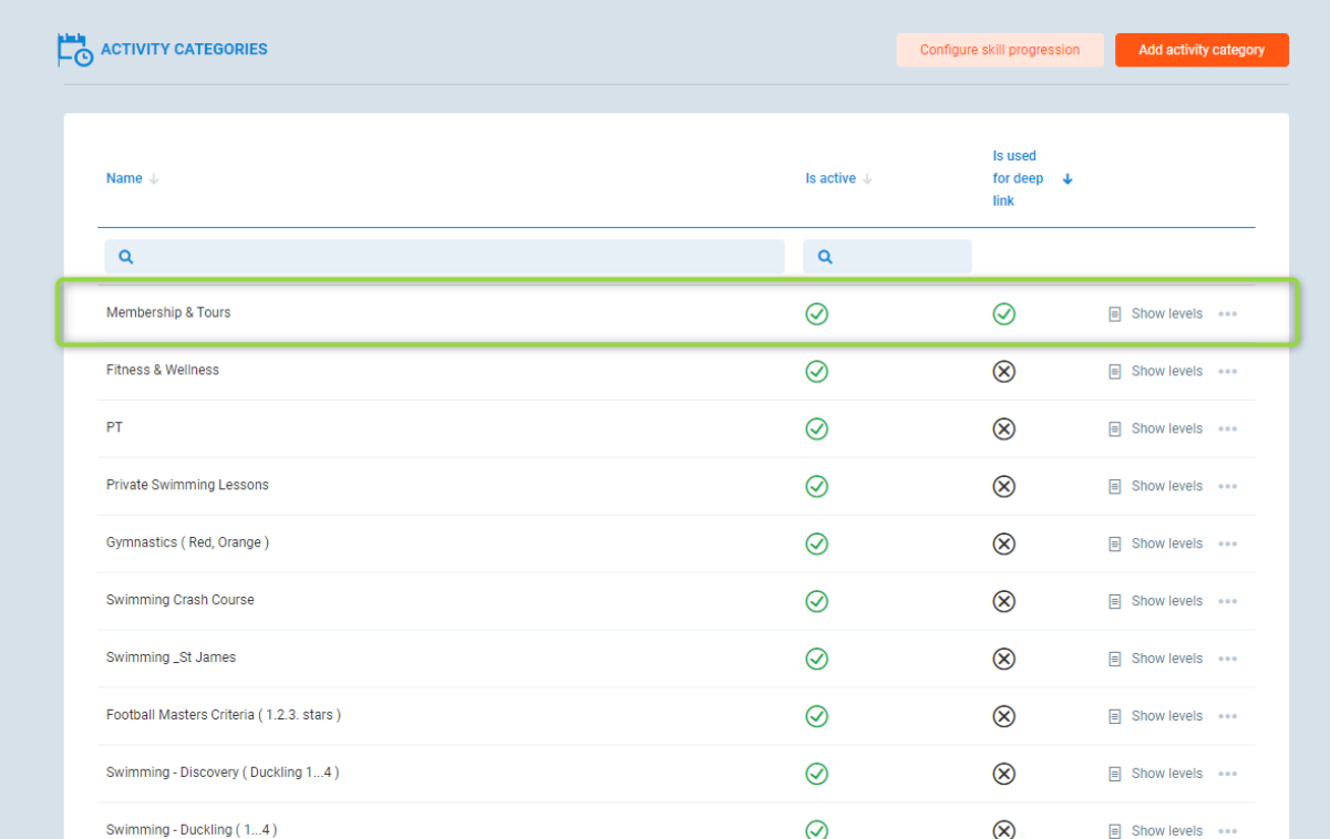 After completing the configuration, you can easily see which categories have this option enabled. You can find this information under Is used for deep link column in the Activity Categories tab.