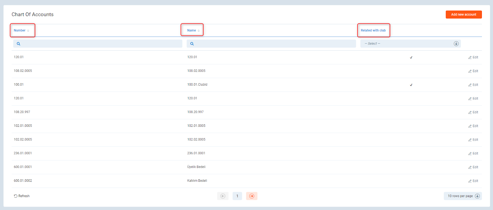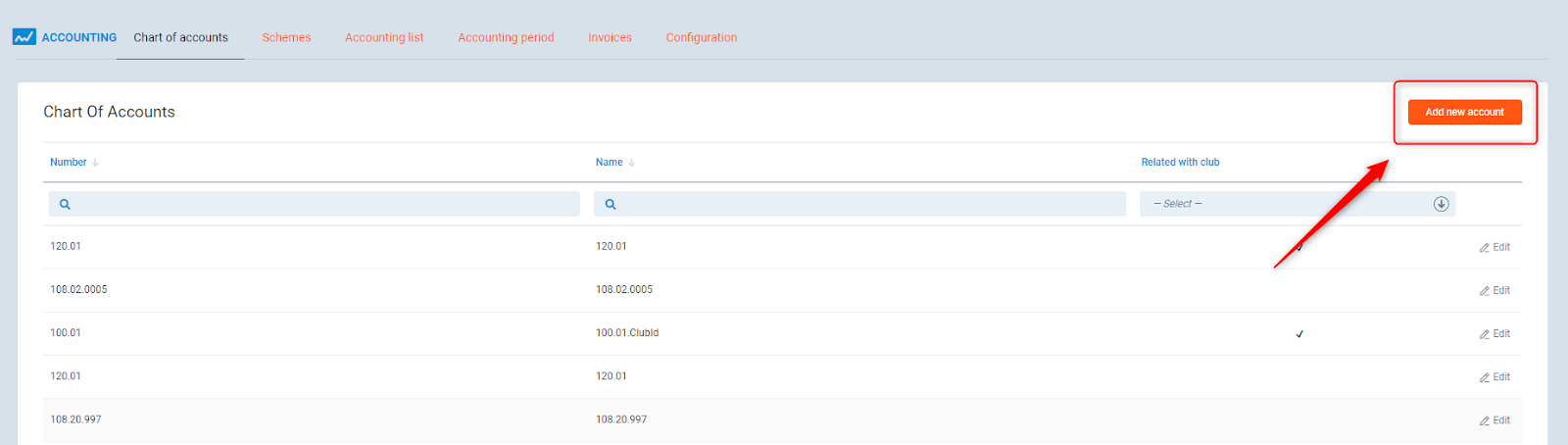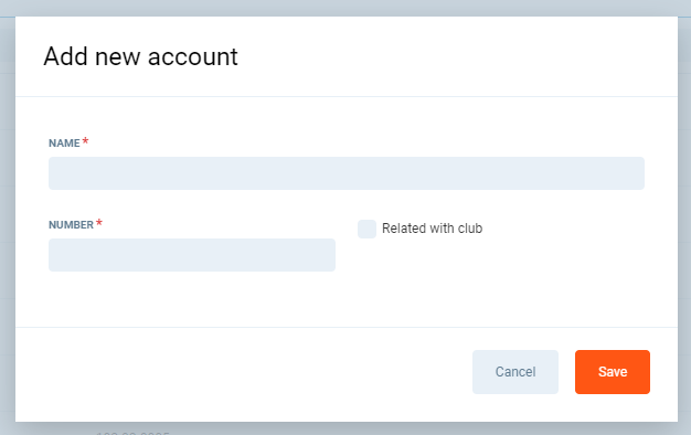 To create a new accounting number, click the “Add new account button”. Fill up Name, Number and decide whether this number is related to the club.