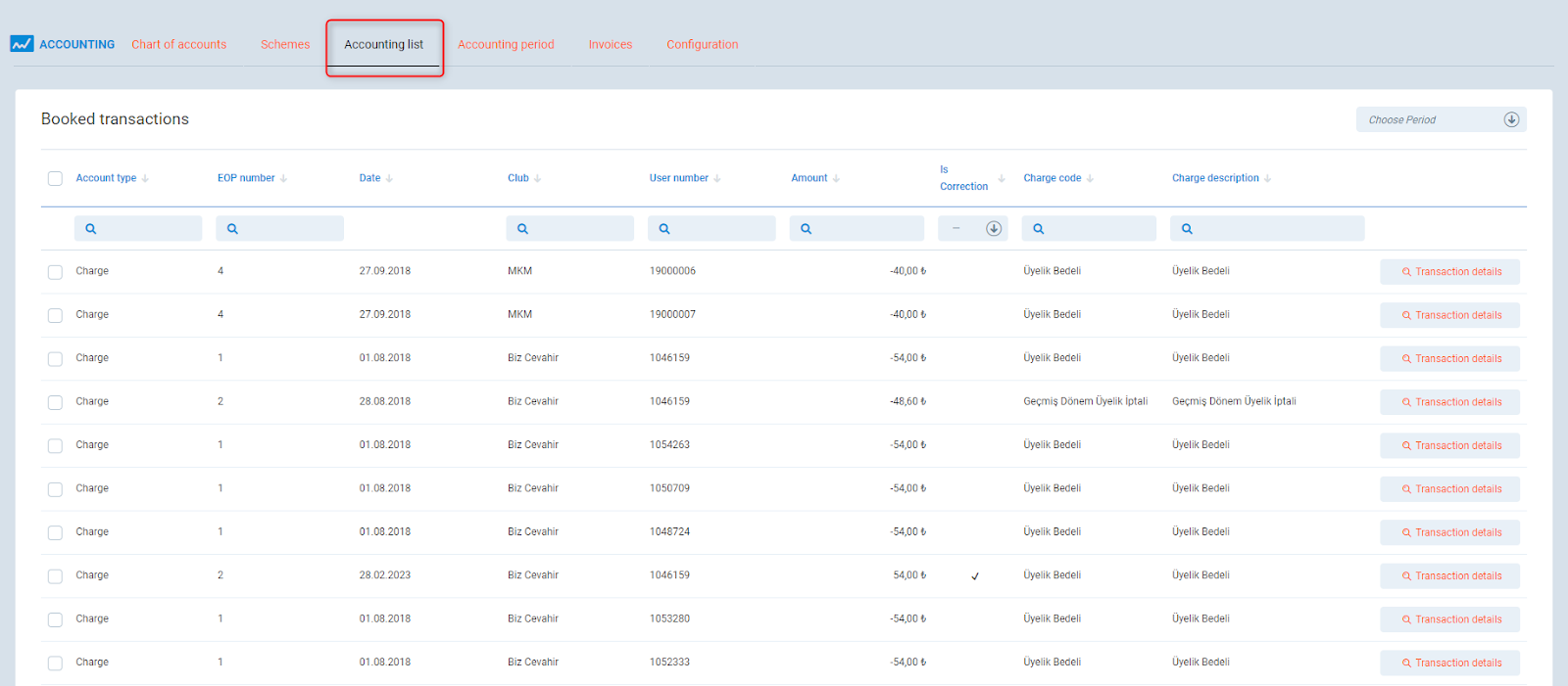 To correct a transaction, add a manual ChargeCancellation type transaction, that points to the original, incorrect one within the closed period. Credit Note, which is a correction, is created. It has the opposite amount to the original transaction and is accounted on “minus” accounts.