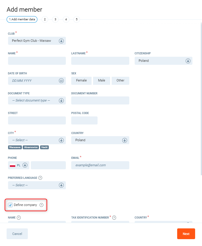 3. Add personal details, then tick the checkbox Define company to connect the company with a new member.