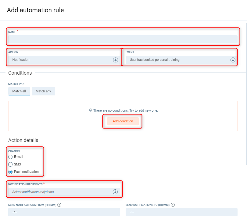 From this article, you will learn how to send automatic push notifications (text messages) to instructors using automation rules. These notifications will be visible to PerfectGym Pro mobile app users.