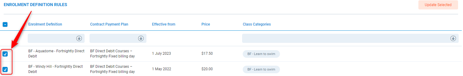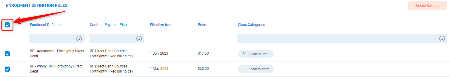 Note: Using the bulk price increase function is effective if you are increasing a number of enrolment rules by the same price/percentage